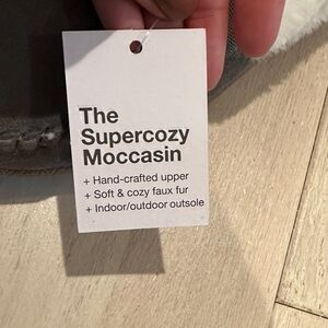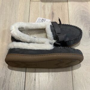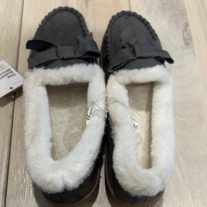 Charcoal moccasins with ivory plush lining. Soft and stylish. Ideal for lounging. Size 9/10