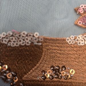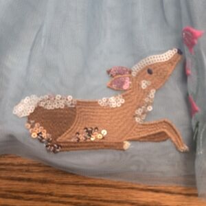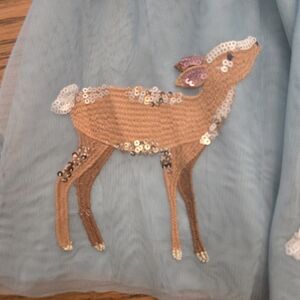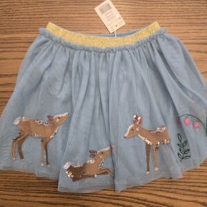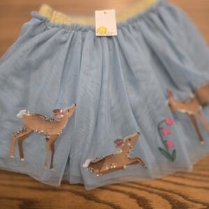 Charming blue skirt with deer embroidery. Features a glittery gold waistband. Perfect for playful outings.