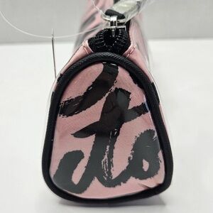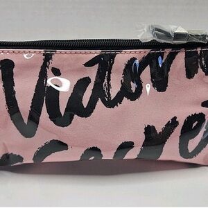 Victoria's Secret cosmetic pouch with a bold black graphic script on a pink background. Ideal for organizing beauty essentials.