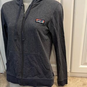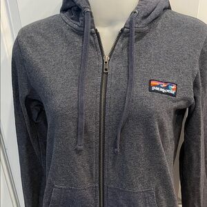 Patagonia hoodie with full zip closure. Features front pockets and Patagonia chest logo. Drawstring hood