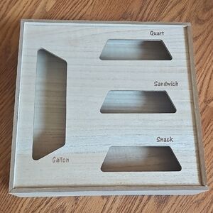 Natural wood organizer for ziplock bags. Features compartments for gallon, quart, sandwich, and snack sizes.
