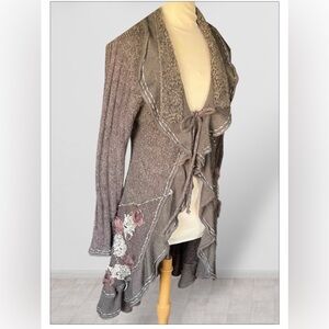 Embrace elegance with a boho, western flair. One of a kind, hand sewn, it has scalloped layered edges, raised appliqué, long and lean style with extra long slightly belled sleeves. Wear it tied or open. I added a Western belt.