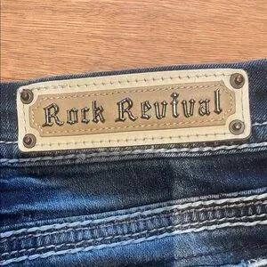 Chic boot cut jeans with contrast stitching. Dark blue hue for versatile style. Signature Rock Revival detailing.