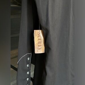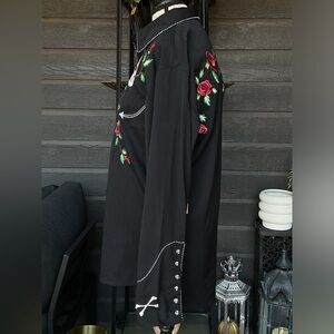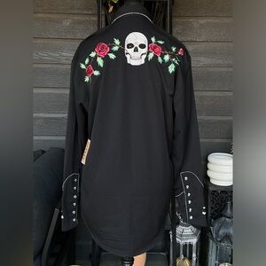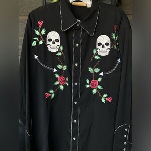 New with Tags. This is a vintage Scully Western shirt for men, featuring a black solid design with embroidered rose an skulls detail with black and white intertwined piping with unique pearl snap skull print buttons. Size S. Measures approximately 22” flat across chest and approximately 30-32” in length. No returns. Thank you.