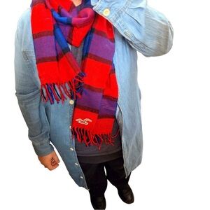 Hollister Buffalo Plaid Blanket Scarf Red Purple Blue Oversized Fringe