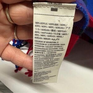 Elevate your cold-weather layering with this Hollister buffalo plaid blanket scarf. Features a distinctive red, violet, blue, and black colorway that stands out from standard plaids. Oversized silhouette measures 16.5” x 78”, making it perfect for wrapping, draping, or styling as a shawl. Soft 100% acrylic knit with classic fringe detailing. Pairs beautifully with denim, neutrals, or leather for an effortlessly cool look. Excellent pre-owned condition with no signs of wear. Hand wash cold, lay flat to dry.