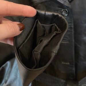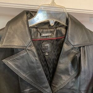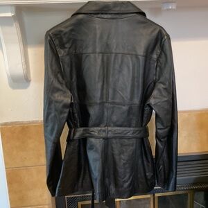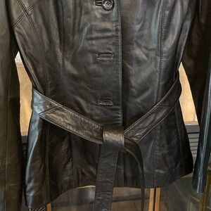 Classy, sleek, women’s leather jacket with belt. Closet kept, smoke free home! Some signs of wear as pictured on collar, barely noticeable. Soft, comfortable leather.