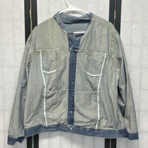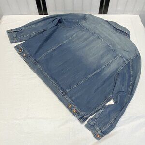 Vintage Long Sleeve Button Up Denim Jeans Bomber Style Jacket from NorthCrest Women’s Plus. Lovingly worn – looks gently broken in. Midweight jeans jacket is designed with collar and copper hued button up front. Yoked front and back. Front has multiple topstitched seams; outermost encompasses pocket on each lower side and two upper flap pockets at yoke, between the seams. Relaxed silhouette in faded medium blue wash. Long sleeves with wide vented buttoned cuffs. Band at hem with two button adjustment at sides. Unlined. Hits below waist. Wear for an easy retro streetwear, Y2K, or casual everyday look.