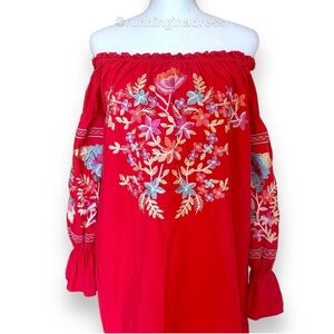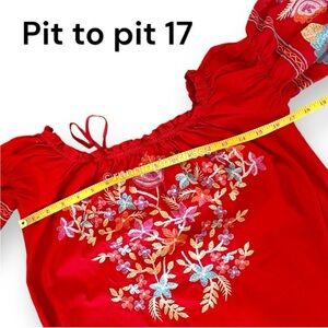 Free People Enchanted Garden Mini Dress In Red With Floral Embroidery Size XS. Enchanted Garden Mini Dress a beautiful mini dress featuring a simple shift silhouette with enchanting garden-inspired embroidery allover and a femme off-the-shoulder neckline. Elastic at the neckline and sleeves for comfortable wear.