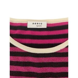 Preowned Akris Punto pullover sweater in size 10. Metallic stripes in magenta pink, black and white. Long sleeves, round neckline. Made from 75% wool, 25% polyester. Thin, stretchy, lightweight knit fabric. The metallic color is only visible on the outside and is subtle, not flashy unless the light hits it just right. Would be perfect for the holidays.