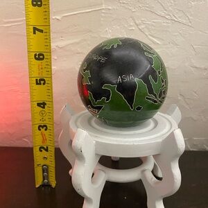 Explore the world with this elegant black and green globe, beautifully displayed on a white stand. Perfect for adding a touch of sophistication to any room. Hand made by a little boy with craftsmanship in South Africa. Geographically incorrect with inconsistencies in continent placement but genuine attempt from the maker. Truly a piece of great pride and heritage from the region.