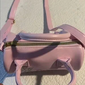 Brand new with tags never worn. So cute! Juicy Couture mini barrel satchel bag with rhinestone logo accents. Light pink color. About 7.5 inches X 5 inches