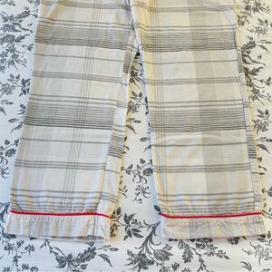• one pair grey & cream plaid with orangish red piping, button down top, and adjustable ribbon tie waist on pants.