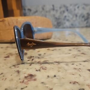Maui Jim polarized sunglasses. Used and in great condition. Rims are plastic, with a brown light stripe pattern on the outside and a light blue on inside. Lens have some small scratches, not noticeable while wearing. The sunglasses come with case and cleaning cloth. Both have evidence of wear.