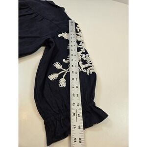 Chicos Linen Blouse Womens Size 2 12 Classic Navy Embroidered Ruffle Sleeve