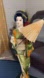 Elegant Japanese Geisha doll in a green kimono with floral patterns, holding a parasol.