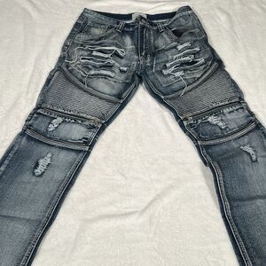 Stylish men's distressed jeans in a classic washed blue jean color with zipper accents. Perfect for a casual, edgy look.