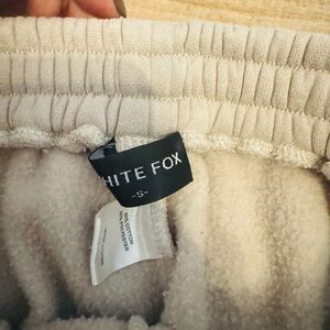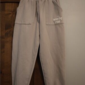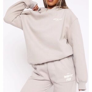 Cozy gray track pants and hoodie set. Features bold White Fox branding on the back. Perfect for casual wear.