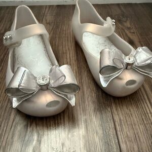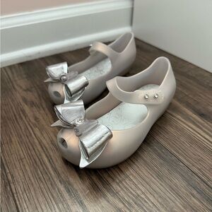 Chic kids dress shoes with a stylish bow. Elegant silver finish. Perfect for special occasions.