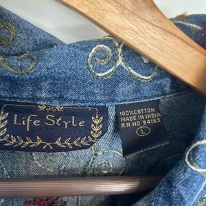 Life Style Women's Floral Embroidered Denim Jacket Sz Large Casual Button Up
