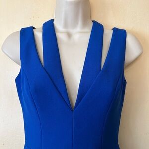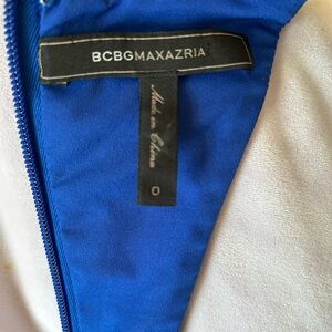 BCBGMAXAzria full length formal gown in royal blue. The top features cutouts. The skirt is a bit shorter in front than back for an elegant silhouette. Fitted through the waist. Lined to the knees. Perfect for your next holiday party. Excellent condition