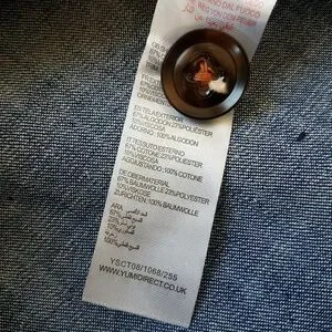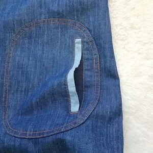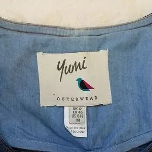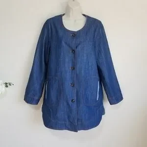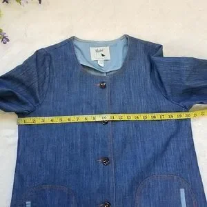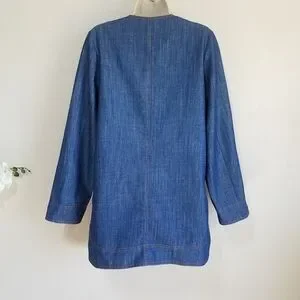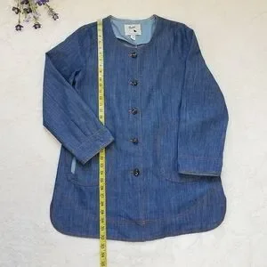 In excellent condition, denim front button down coat, front pockets, extra button, parka, size medium.