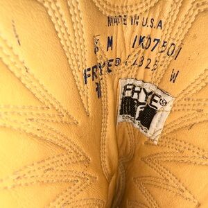 Classic Frye boots in tan leather. Features detailed stitching. Ideal for a western style. Unknown if size is men’s or woman’s but assumed men’s due to length