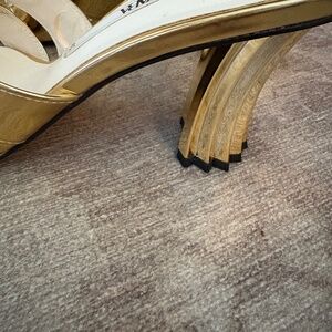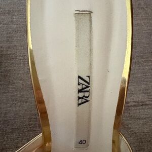 Zara gold heeled sandals . The heel measures 3 inches from the backside. Stylish dress up or dress down. Used ONCE