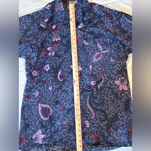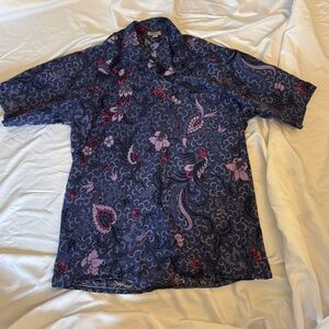 Stylish button-up shirt with a vibrant floral pattern. Features shades of blue, pink, and purple.