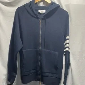 Elegant dark blue hoodie with signature white stripes on the sleeve. Perfect for casual wear.