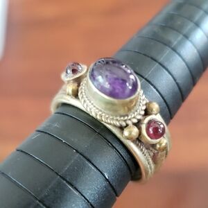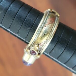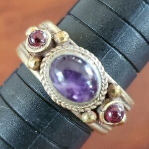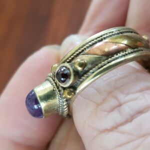 Tri color band of brass, copper and silver with intricate braided detail. Prominent stone is a purple amethyst, flocked with a small red (ruby? garnet?) stone on either side. SIZE 10 Good vintage condition.
