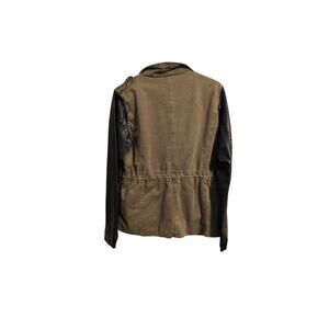 Edgy and stylish faux leather motorcycle jacket featuring a green front panel and studded sleeves. Perfect for adding a statement to any outfit, ideal for casual wear or nights out.
