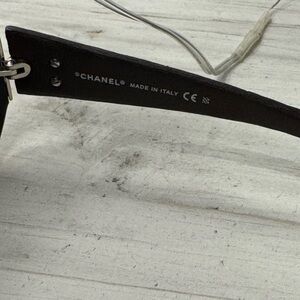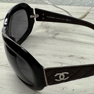 *Authentic* Chanel oversized, black sunglasses with brown, goat-skin quilted frame detailing and silver logo. Lens are in good general condition with very minimal wear and no flaws that affect visibility. Come with original bag, tags, case, and box.