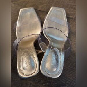 Stylish and minimal Schutz heels in metallic gold with clear PVC straps. These have the signature bamboo sculpted heel that Schutz is known for, plus a modern square toe. They were worn only a couple of times and are still in excellent condition with normal light wear on the soles.