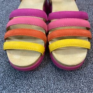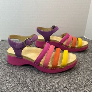 Vibrant Dansko Roxie Sandals with purple, pink, orange, and yellow straps. Comfortable and stylish for any occasion. Made of a Milled or Nubuck leather upper and lining. Rubber outsole. It is very Comfortable for any kind of occasion. Size Women's 37.