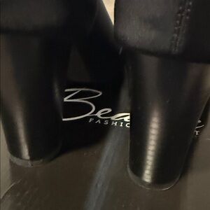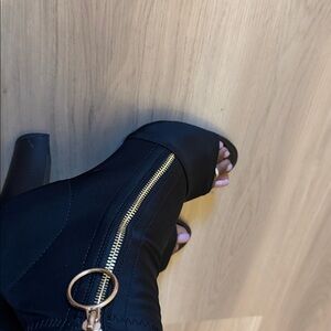 Elegant black heeled boots with a chic peep-toe design. Features a stylish gold zipper accent. Perfect for elevating any outfit. 3.5” heel. New with the box. Excellent condition. Black stretchy material with gold functional zipper. Very comfortable and sexy heels.