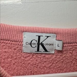Soft blush pink sweatshirt with Calvin Klein Jeans logo. Fun stitched lettering adding to the vintage style.