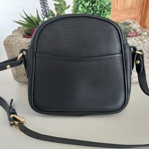 This is a rare, Camera Bag. Original color was dark navy blue Pebbled AWL Leather with Brittish trim. The bag is from the early 1990s. Includes the original Brass Duck FOB. Date tag is pictured. The bag has one outside pocket on the bag to put keys in. The inside is fairly clean, has some pen marks, not too bad. Interior is light blue suede. The piping trim is great. I decided to spa-day her and make it all monochromatic matte-black!!! I also dyed the zipper webbing with fabric dye. The zipper works great, made of brass. I shined up the brass hardware all throughout. The strap is in great condition too. It fits a cell phone and keys and a small coin purse or narrow wallet all together. Cutest crossbody!! So well made, after all these years!
