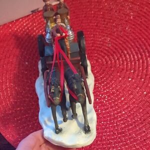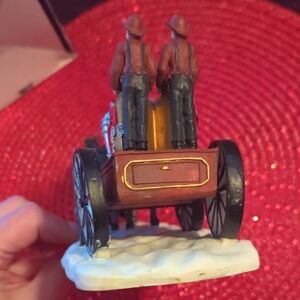 Enhance your festive decor with this charming horse-drawn fire engine accent. Featuring rich red and classic black tones, it's a delightful addition to any home.