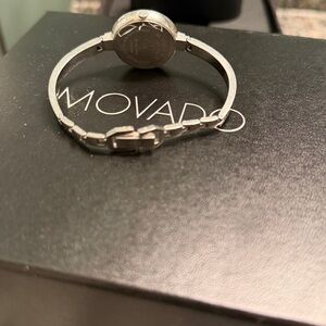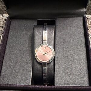 Stylish Movado watch with a silver band and pink dial. Ideal for any occasion.