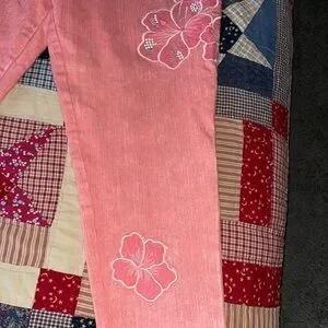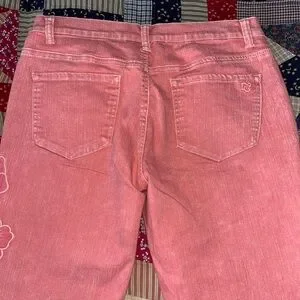 Diane Gilman pink floral embroidered jeans. Used with slight wear but still look great! The design is well stitched and the rhinestones are all in tact and secure. No rips or holes and the hems are designed to be frayed with no hem. These are super cute on!