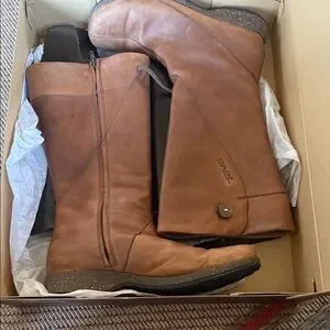 Elegant chestnut leather boots with side zipper. A decorative button and TEVA imprint. Comfortable and versatile. 1.38 heal, 14 inches tall, 7 inches shaft