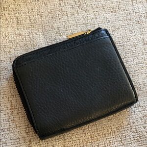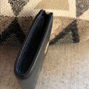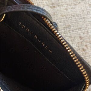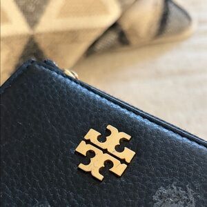 Chic black wallet featuring a gold Tory Burch emblem. Sleek and functional.