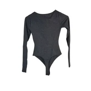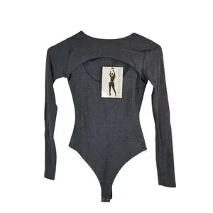 Naked Wardrobe The Come Around charcoal gray thong-style, lomg-sleeve, peek-a-boo chest cutout bodysuit! Women's size xs in new condition with tag attached. Approximate measurements laying flat: shoulder to shoulder: 11.5", armpit to armpit: 13", shoulder to bottom of sleeve: 22.5", shoulder to bottom of thong area: 25". Charcoal gray, soft, stretchy rayon blend material, snap closure at the crotch, long sleeves, and sexy cutout at the chest. So cute, sexy, and ready to help you look your best this season! Grab this today!