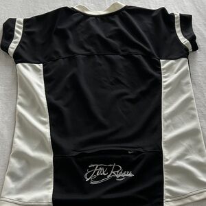 Sleek Fox jersey with striking black and cream accents. Perfect for active wear. Zipper pocket on back of shirt for cell phone keys, etc. drivers license.!