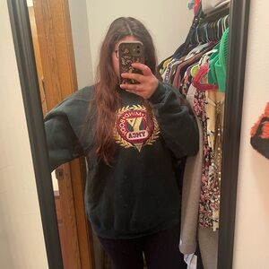 This vintage green sweatshirt features the YMCA logo embroidered on the front with a fleece like lining.