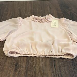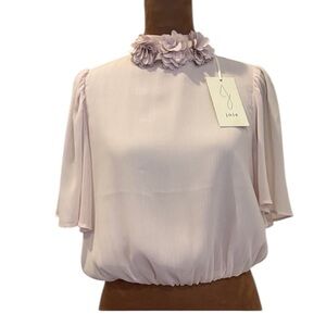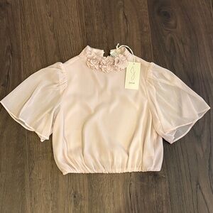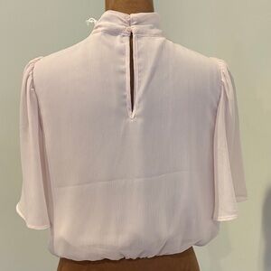This elegant light pink blouse features a delicate floral collar, perfect for adding a touch of sophistication to any outfit. The soft fabric and flowing sheer sleeves offer comfort and style. Elastic waistband provides stylish soft blousy look.