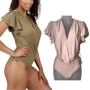 Haute Monde womens flutter butterfly sleeve wrap bodysuit; chic preppy cocktail versatile transitional stylish trendy cruise resort vacation barbie clubbing femme balletcore polished sleek business casual career staple office suit separates boho modern coastal coquette girl birthday gift present romantic girly practical statement Haute Monde Ruffle Butterfly Flutter Sleeve V-Neck Wrap Over Drape Bodysuit Top