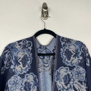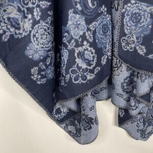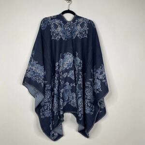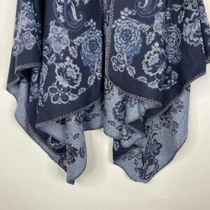 Super Cute and cozy! Bohemian chic statement fashion open front wrap around poncho with floral pattern. Oversized blanket sweater, Navy Blue with Light Blue and Gray. 52" x 58"