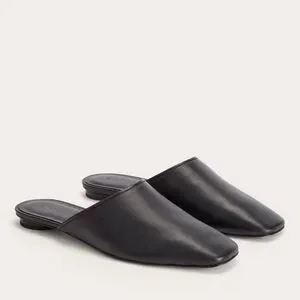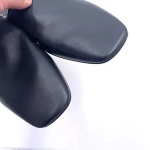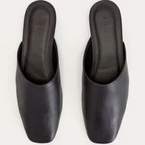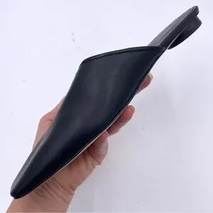 Sleek black leather mules. Minimalist design. Comfortable slip-on style. Did not wear as shoes are too narrow for me. Brand new beautiful soft leather. Sadly they don’t fit my wide feet.